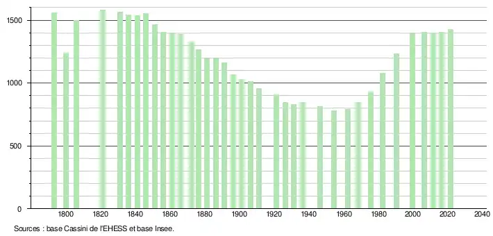 L'évolution du nombre d'habitants est connue à travers les recensements de la population effectués dans la commune depuis 1793. Pour les communes de moins de 10 000 habitants, une enquête de recensement portant sur toute la population est réalisée tous les cinq ans, les populations légales des années intermédiaires étant quant à elles estimées par interpolation ou extrapolation[33]. Pour la commune, le premier recensement exhaustif entrant dans le cadre du nouveau dispositif a été réalisé en 2006[34].