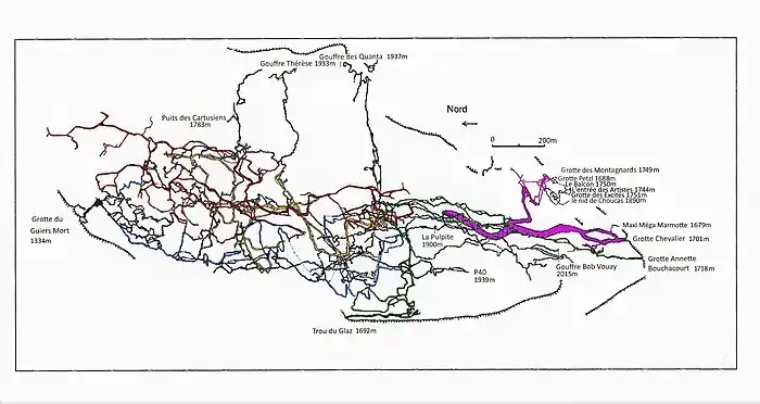 La dent de Crolles compte près de soixante kilomètres de galeries explorées et, courant 2023, dix-huit entrées distinctes[45] : l'exsurgence du Guiers Mort[N 2] (1 334 m) et la grotte Bis, le trou du Glaz[N 3] (1 692 m), les grottes Annette[N 4] (1 718 m), Chevalier[N 5] (1 701 m), des Montagnards (1 749 m), la grotte des Excités (1 751 m), l'entrée des Artistes (1 744 m), le Balcon (1 750 m) et le nid de Choucas (1 890 m), les gouffres Thérèse[N 6] (1 933 m), P40[N 7] (1 939 m), des Quanta[N 8] (1 937 m), des Cartusiens[N 9] (1 783 m), Bob Vouay[N 10] (2 015 m), Pulpite[N 11] (1 900 m), du Cœur (1 905 m) et une entrée baptisée Maxi Méga Marmotte proche de Chevalier[N 12] (1 679 m) ; la grotte Petzl [N 13](1 688 m) est isolée du reste du réseau par une trémie[9],[46],[47]. Cet important réseau offre plusieurs possibilités de traversées[46],[47],[N 14] et lui assurent une importante notoriété parmi les spéléologues du monde entier[48]. La traversée entre le trou du Glaz et la grotte Annette est la plus classique et la plus accessible pour les débutants, avec uniquement six passages en rappel de trente mètres maximum, pour une durée d'environ six heures[46]. La traversée entre le P40 et le trou du Glaz offre 249 mètres de dénivelé, quelques puits arrosés dans la partie basse et des méandres relativement étroits qui demandent une bonne technique ; elle peut être enchaînée en traversée jusqu'à l'exsurgence, avec un passage intermédiaire à hauteur du puits P36 un peu plus technique mais débouchant sur de vastes galeries fossiles soumises à des courants d'air. Chacun des deux tronçons nécessite six heures de progression[46]. La plupart des itinéraires souterrains nécessitent de descendre et parfois remonter des puits[46],[47].