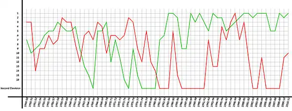Maccabi Haïfa (ligne verte) et Hapoël Haïfa (ligne rouge) dans le Championnat d'Israël au fil des années.