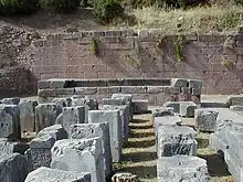 - deux trésors côte à côte en marbre, ceints ultérieurement d'une palissade en calcaire sur laquelle étaient gravés des textes en rapport avec une confiscation de biens au profit du sanctuaire.