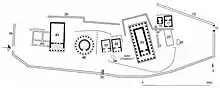 Le premier problème concerne le nombre d'édifices, puisque, mis à part le bâtiment le plus à l'est, qui semble avoir disparu assez tôt, on compte cinq - et non quatre - édifices importants :
