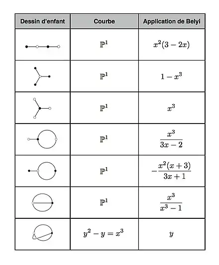 Le théorème d'existence de Riemann, et plus généralement les théorèmes d'algébrisation GAGA affirment que tout revêtement fini de la sphère de Riemann se réalise par analytification d'un revêtement de la droite projective. En particulier si est une paire de Belyi (cf. le paragraphe précédent), on peut supposer que est une courbe algébrique (projective, lisse) définie sur (cf Théorème de Belyi et action galoisienne). On peut alors parler des équations d'un dessin d'enfant : ce sont celles qui définissent la courbe d'une part, et celles qui définissent le revêtement de l'autre. Il est important de remarquer que ces équations ne sont pas uniques. Il est assez facile d'obtenir les équations des dessins d'enfant ayant un degré relativement petit, mais le cas général se révèle bien plus difficile. La figure 4 fournit la liste des équations des dessins d'enfants de degré .