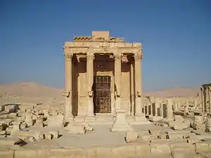 En , la reprise de Palmyre par les forces du régime syrien confirme que les quatre tétrapyles de Palmyre ainsi que la porte monumentale du front de scène du théâtre romain ont été endommagés à l'explosif[22].