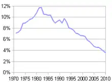 Le taux d'endettement maximum, exprimé en % du PIB, a été atteint en 1993. Le montant de la dette, en devises constantes, a quant à lui continué d'augmenter jusqu'en 1995. Puis tous deux ont diminué jusqu'en 2007. La crise de 2007 a entraîné une augmentation du taux d'endettement de 12 points de 2008 à 2010. Celui-ci diminue ensuite à partir de 2015.