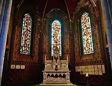 - Velles, église Saint-Étienne, baie 3 : Notre-Dame de Lourdes, vitrail réalisé après-guerre par Georges Dettviller