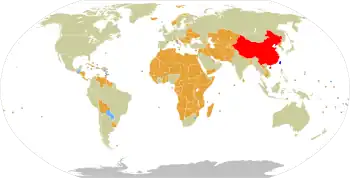 La politique du gouvernement de la RPC stipule que tout pays qui souhaite établir une relation diplomatique avec la RPC doit d'abord mettre fin à toute relation formelle avec la RdC. Selon le Fletcher Forum of World Affairs (en), « la non-reconnaissance du gouvernement taïwanais est une condition préalable à l'établissement de relations diplomatiques formelles avec la RPC, forçant en fait les autres gouvernements à choisir entre Pékin et Taipei ». Dans l'ordre. pour concourir à la reconnaissance des autres pays, chaque gouvernement a donné de l'argent à certains petits pays. Plusieurs petits pays d'Afrique et des Caraïbes ont établi et rompu à plusieurs reprises des relations diplomatiques avec les deux parties en échange d'un énorme soutien financier de chaque côté. La RPC utilise également son influence internationale pour interdire à la RdC de participer à des événements internationaux tels que les Jeux olympiques sous son nom officiel. Au lieu de cela, la RdC a été contraint d'adopter le nom de Taipei chinois pour participer à de tels événements depuis les années 1980. De plus, dans les communiqués de presse et autres médias, la RPC ne fait jamais référence à la RdC en tant que telle, se référant plutôt au territoire de Taïwan comme « la province chinoise de Taïwan » et au gouvernement de la RdC comme « l'autorité de Taïwan ».