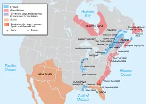 En 1712, la Grande-Bretagne et la France signent un armistice et un traité de paix définitif est signé l'année suivante. La Nouvelle-France fait les frais de la déconfiture française en Europe. D'après les termes du traité d'Utrecht de 1713, la Grande-Bretagne obtient l'Acadie (qu'elle renomme Nouvelle-Écosse), la souveraineté sur Terre-Neuve, la Baie d'Hudson et Saint-Christophe dans les Antilles. La France reconnait la suzeraineté britannique sur les Iroquois[61] et accepte que le commerce avec les Amérindiens de l'intérieur des terres soit ouvert à toutes les nations[62]. Elle conserve cependant toutes les îles du Golfe du Saint-Laurent, dont l'Île du Cap-Breton, les zones de pêche de la région et le droit de sécher le poisson sur la côte nord-ouest de Terre-Neuve[63].