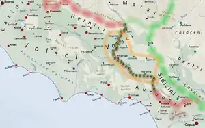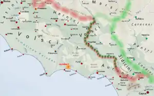 - Limite approximative des sphères d'influence romaine et samnite à la suite du traité de 354[N 1]