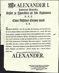 À la suite des guerres napoléoniennes, la Russie entre en guerre avec la Suède. Puis, en raison des traités existants entre la Suède et la Finlande, elle annexe à son Empire, les six provinces finlandaises ayant fait partie de la Suède depuis 600 ans. Les résolutions prises pendant la guerre, sont ratifiées durant la session de la Diète de Porvoo : le tsar Alexandre Ier de Russie y règle, pour l'essentiel « les rapports avec ses nouveaux sujets »[2]. La Finlande, devient un grand-duché, Allexandre Ier s'engage à respecter son autonomie[3].