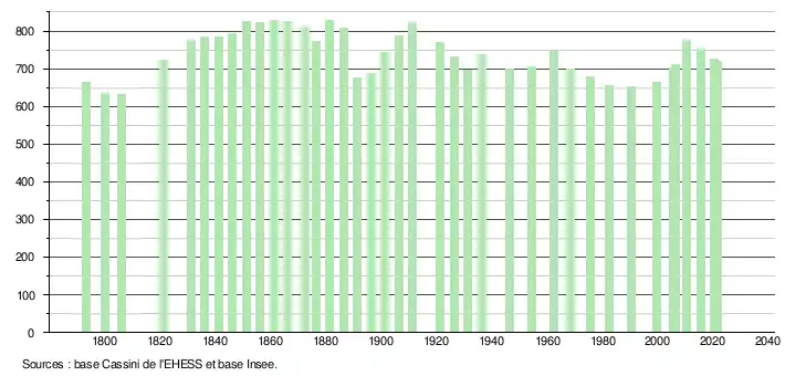 L'évolution du nombre d'habitants est connue à travers les recensements de la population effectués dans la commune depuis 1793. Pour les communes de moins de 10 000 habitants, une enquête de recensement portant sur toute la population est réalisée tous les cinq ans, les populations légales des années intermédiaires étant quant à elles estimées par interpolation ou extrapolation[35]. Pour la commune, le premier recensement exhaustif entrant dans le cadre du nouveau dispositif a été réalisé en 2005[36].