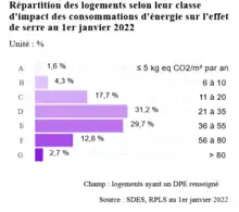Dans le cadre de la lutte contre l'« habitat indigne » et la précarité énergétique, la mise en location des logements classés G, F et E, dits « passoires thermiques »[2], sera interdite respectivement à partir de 2025 (classe G), 2028 (classe F) et 2034 (classe E). Depuis 2022, les logements de classes F et G font aussi l'objet d'un gel des loyers[3] pour les locataires déjà titulaires d'un bail comme lors d'une relocation et les annonces de vente ou de location portant sur ces logements doivent obligatoirement porter la mention « Logement à consommation énergétique excessive »[4].