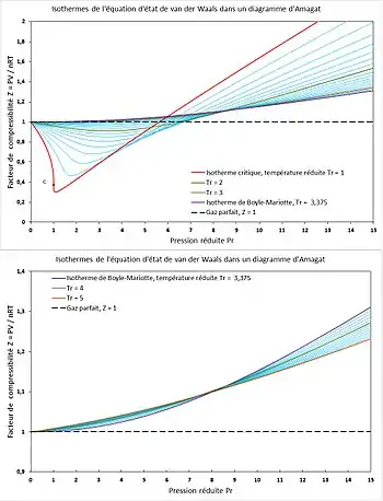 La figure 3 représente le diagramme d'Amagat normé d'un gaz répondant à l'équation d'état de van der Waals : cette équation d'état représente qualitativement le comportement des gaz réels. On constate qu'à pression constante, aux basses pressions lorsque la température croît le facteur augmente, aux hautes pressions diminue lorsque la température augmente, pour tendre vers 1 : aux hautes températures le comportement des gaz réels tend vers celui des gaz parfaits.