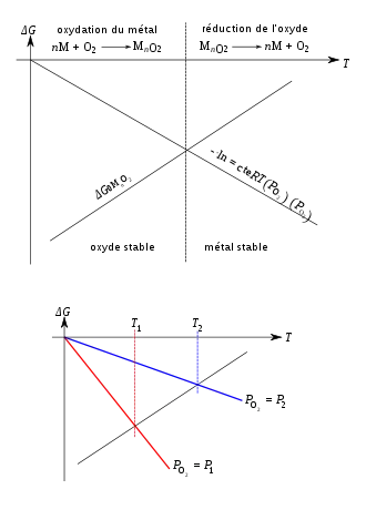 Le diagramme d'Ellingham représente la variation d'enthalpie libre standard de formation d'un oxyde à partir d'un métal ou d'un oxyde inférieur en fonction de la température. L'équation bilan est ramenée à la consommation d'une mole de dioxygène, même si d'autres coefficients sont fractionnaires. Pour la formation de l'oxyde du chrome (III) par exemple, les données réfèrent à l'équation