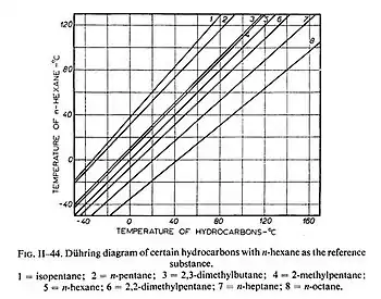 Expérimentalement, dans ce type de diagramme, pour des liquides de même famille, les courbes obtenues sont quasiment des droites (par exemple pour des solutions aqueuses, voir figure 1 et figure 2, ou pour les hydrocarbures, voir figure 3). Dühring en a tiré la loi des températures d'ébullition correspondantes ou règle de Dühring (1878)[2]. La règle de Ramsay-Young, énoncée postérieurement (1885-1886) et indépendamment, est une version moins précise de cette loi[3]. Il suffit donc de connaitre la courbe d'ébullition d'un liquide de référence ainsi que quelques points d'ébullition d'un liquide quelconque pour en déduire, par des relations simples, la courbe d'ébullition de ce liquide.