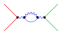 Dans les diagrammes de Feynman, les propagateurs sont les contributions des particules virtuelles. Leur nom vient du fait qu'ils décrivent la propagation de ces particules qui se déplacent librement sauf aux points d'émission ou d'absorption[51]. Richard Feynman a appliqué les fonctions de Green aux particules élémentaires sous la forme d'un opérateur particulier de la théorie quantique des champs qu'il a nommé propagateur[52].