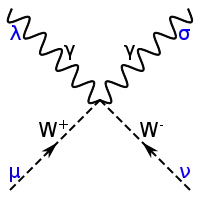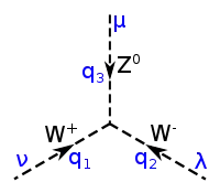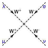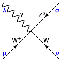 L'interaction faible fait intervenir ses trois bosons de jauge, le boson W dans ses deux états, et , ainsi que le boson [37]. Ces médiateurs sont généralement tracés avec une ligne en pointillés ou une ligne ondulée (la même que celle du photon) annotée avec la lettre du boson correspondant. La ligne droite fléchée s'étend ici aux quarks et aux autres leptons, accompagnée de leur symbole.