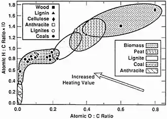 - van Krevelen, D.W. (1950). "Graphical-statistical method for the study of structure and reaction processes of coal", Fuel, 29, 269-84.