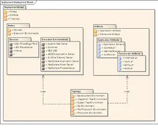 Les diagrammes de paquetages peuvent utiliser des paquetages pour illustrer les différentes couches de l'architecture en couches d'un système logiciel. Les dépendances entre paquetages peuvent être parés d'étiquettes ou de stéréotypes pour indiquer les mécanismes de communication entre les couches.