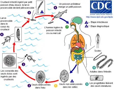 Les ténias adultes peuvent infecter les humains, les canidés, les félins, les ours, les pinnipèdes, et les mustélidés, cependant la réalité des cas enregistrés chez certaines des espèces non humaines est contestée. Des œufs non embryonnés sont éliminés dans les selles du mammifère hôte (hôte définitif, où les vers se reproduisent). Dans des conditions appropriées, les œufs ou oncosphère deviennent matures (en 18 à 20 jours approximativement) et dans l’eau se transforment en coracidium (embryon cilié nageur). Après l'ingestion par un crustacé d'eau douce comme un cyclops (le premier hôte intermédiaire) le coracidium devient une larve procercoïde (d’aspect vermiforme). Après l'ingestion du crustacé par un deuxième hôte intermédiaire, en général un vairon ou un autre petit poisson d'eau douce, les larves de procercoïdes sont libérées du crustacé et migrent dans la chair du poisson où elles se transforment en larves plérocercoïdes. Les larves plérocercoïdes constituent l'étape contagieuse pour l’hôte définitif (humains y compris).