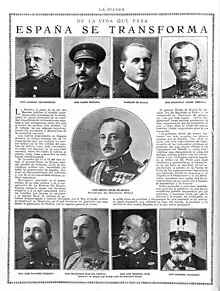 Le 14 septembre 1923, l'état de guerre fut déclaré, qui durerait jusqu'au 16 mai 1925[75]. Le 15 septembre, le décret royal établissant un directoire militaire assumant toutes les fonctions du pouvoir exécutif fut approuvé. Primo de Rivera devint chef et unique membre du gouvernement. Le reste du Directoire était composé de généraux de brigade à raison d'un représentant pour chaque capitainerie générale, ainsi que du marquis de Magaz, Antonio Magaz y Pers (contre-amiral), représentant la Marine. Les généraux membre du Directoire étaient : Adolfo Vallespinosa Vior (I Région Militaire), Général d'Artillerie Luis Hermosa y Kith (II Région Militaire), Luis Navarro et Alonso de Celada (III Région Militaire), Dalmiro Rodríguez Pedré (IV Région Militaire), Antonio Mayandía y Gómez (Ve région militaire), le général Francisco Gómez-Jordana y Souza (VIe région militaire), Francisco Ruiz del Portal (VIIe région militaire) et Mario Muslera y Planes (VIIIe région militaire).