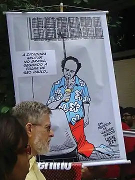 Manifestation de 2009. On lit sur l'affiche, dépeignant ironiquement Vladimir Herzog, le journaliste assassiné en 1975, en tenue décontractée, avec la légende sarcastique: « la dictature militaire au Brésil, selon Folha de S.Paulo ».