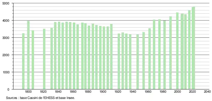 - Population municipale légale en vigueur au 1er janvier 2024, millésimée 2021, définie dans les limites territoriales en vigueur au 1er janvier 2023, date de référence statistique : 1er janvier 2021.