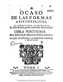 L'année de sa mort, est publiée son œuvre fondamentale et inachevée, le Crépuscule des formes aristotéliciennes, où l'éclectique Diego Zapata défend la physique et la médecine modernes[1] ; il « tente de concilier ce qu'il juge le plus commode des différentes doctrines (galénique, iatromécanique, iatrochimique, etc.), en ayant toujours sa propre expérience comme critère de base. Il accepte sans réserve le schéma harveyien de la circulation sanguine, mais quant à la texture de ce liquide, bien qu'il la décrit à partir de Raymond Vieussens et de Robert Boyle, il tente ensuite de prouver avec Galien « la diversité des particules du sang ». Elle met également en évidence l’incompatibilité entre l’acceptation de la circulation sanguine et la pratique de la saignée »[3]. Malgré ses nombreuses traductions, cet ouvrage est placé à l'Index librorum prohibitorum par le Vatican.