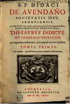 - 1668 - Diego de Avendaño, Thesaurus indicus, seu Generalis instructor pro regimine conscientiae in iis quae ad Indias spectant, (œuvre littéraire), Anvers, , [lire en ligne]