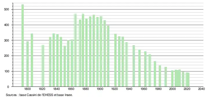 L'évolution du nombre d'habitants est connue à travers les recensements de la population effectués dans la commune depuis 1793. Pour les communes de moins de 10 000 habitants, une enquête de recensement portant sur toute la population est réalisée tous les cinq ans, les populations légales des années intermédiaires étant quant à elles estimées par interpolation ou extrapolation[16]. Pour la commune, le premier recensement exhaustif entrant dans le cadre du nouveau dispositif a été réalisé en 2004[17].