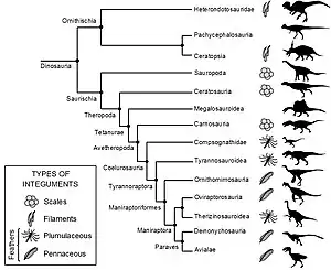 La plupart des dinosaures non aviens connus pour avoir eu des plumes ou des protoplumes sont des théropodes, plus particulièrement appartenant au clade des Coelurosaures. Toutefois, des structures tégumentaires filamenteuses ont été observées chez certains dinosaures non théropodes, tels les ornithischiens Tianyulong et Psittacosaurus. La nature exacte de ces structures fait l'objet de débats, Tianyulong portant de simples filaments relativement rigides[27],[28]. Un autre ornithischien, Kulindadromeus, s'est révélé porteur de structures plus complexes[29],[30].