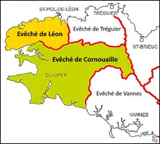 ![]() Carte montrant les évêchés avant le régime concordataire : l'évêché de Léon au nord du Finistère et celui de Cornouaille au sud du Finistère. |