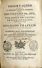 - Observações sobre as principaes causas da decadencia dos portuguezes na Asia, escriptas em forma de dialogo, com o titulo de Soldado pratico(Observations sur les principales causes de la décadence des portugais en Asie, écrites sous forme de dialogue, avec le titre de Soldat expérimenté). Lisbonne, dans l'Off. de l'Académie portugaise des sciences. 1790.