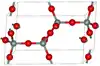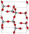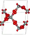Les fibres de silice présentent une structure semblable à celle du disulfure de silicium SiS2, avec des chaînes de tétraèdres partageant certaines de leurs arêtes. La stishovite, forme stable à haute pression, présente en revanche une structure de type rutile, dans laquelle les atomes de silicium sont hexacoordonnés. La masse volumique de la stishovite est de 4,287 g·cm-3, bien supérieure à celle du quartz α, qui n'est que de 2,648 g·cm-3[20]. Cette différence de masse volumique est à mettre en relation avec la variation de coordinence, car les liaisons SiO sont plus longues dans la stishovite — quatre liaisons équatoriales de 176 pm et deux liaisons polaires de 181 pm — que dans le quartz α : quatre liaisons tétraédriques de 161 pm[21].
