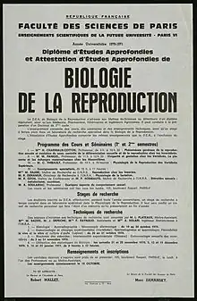 Selon l’arrêté du portant organisation des diplômes d’études approfondies dans les facultés des sciences[6], les études en vue de ce diplôme durent une année. Elles comprennent des enseignements préparatoires à la spécialisation et à la recherche d’une durée de trois heures hebdomadaires au minimum et un stage à temps complet accompli dans un laboratoire pendant huit mois minimum. L’inscription en vue d’un DEA est ouverte aux licenciés ès sciences justifiant de six certificats d'études supérieures dont trois figurant sur une liste, puis, à partir de 1967, aux maîtres ès sciences[7]. Les candidats doivent satisfaire à une épreuve écrite et à une épreuve orale portant sur les enseignements suivis (sanctionnées par une AEA, Attestation d'études approfondies). Ces épreuves sont complétées par la discussion d’un rapport écrit présenté par le candidat sur son stage et sur son travail personnel, destiné notamment à vérifier la possession de la spécialisation choisie et d’une initiation suffisante aux méthodes de la recherche.