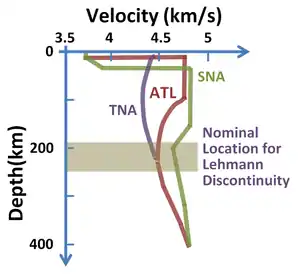 L'autre discontinuité de Lehmann se situe dans le manteau supérieur à une profondeur de 220 ± 30 km[4], et se manifeste par une brusque augmentation de la vitesse des ondes P et des ondes S. Souvent présente sous les continents mais en général pas sous les océans[5], elle n'est pas toujours mentionnée dans les études concernant le manteau supérieur et fait encore l'objet de controverses. Plusieurs explications ont été proposées[6] : une profondeur accrue de l'asthénosphère, une transition de phase[7], ou plus probablement des variations de l'anisotropie des ondes S en fonction de la profondeur[8].