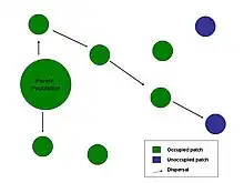 La plupart des populations ont une distribution inégale, ainsi la dispersion a des effets sur la dynamique des populations locale via l’apport ou la perte d’individus[1]. En conséquence, les étapes d’émigration et d'immigration influencent les taux d'extinction (probabilité qu'une population s'éteigne) et de colonisation (probabilité que des individus s'installent avec succès dans un patch) dans un système de métapopulation. Les patchs vides sont plus sensibles à l'immigration et permettent de mesurer un taux de colonisation. Si le patch est occupé par une petite population, l’immigration peut diminuer le taux d'extinction de cette population, en effet, l’augmentation de sa densité permet une meilleure résistance face à la stochasticité démographique, on parle d' « effet sauvetage »[1]. Par conséquent, la création de couloirs de dispersion entre des populations isolées réduit le taux d’extinction. Les différentes stratégies de dispersion peuvent influencer positivement ou négativement la densité de la population. Si l’immigration est densité-dépendante positive, les patchs de densité élevée recevront plus d'immigrants que ceux de faible densité : il y a donc augmentation du taux d'extinction des petites populations[1]. On constate le phénomène inverse lorsqu'on a une immigration densité-dépendante négative. La dispersion peut donc avoir des effets stabilisateurs ou déstabilisateurs sur la dynamique de la population, on peut prévoir la stabilité du système en fonction de la densité et de la dispersion grâce à des modèles. Par exemple, on peut calculer le nombre de patchs occupés dans la métapopulation au cours du temps grâce au modèle de Richard Levins :