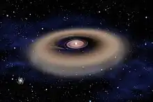 Les étoiles se forment à partir d'un nuage de gaz et de poussières dont la partie centrale s'effondre sur elle-même. Puis, à l'intérieur de la nébuleuse résiduelle, la matière se rassemble en un disque[alpha 1] qui permet la formation de protoplanètes par accrétion. Les astronomes parlent de disque protoplanétaire[2].
