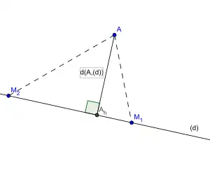 En géométrie euclidienne, la distance d'un point à une droite est la plus courte distance séparant ce point et un point courant de la droite. Le théorème de Pythagore permet d'affirmer que la distance du point A à la droite (d) correspond à la distance séparant A de son projeté orthogonal Ah sur la droite (d). On peut ainsi écrire :