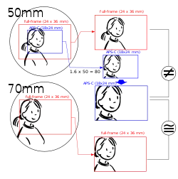 Attention, la conversion donne l'équivalent 35 mm en termes de cadrage mais les propriétés intrinsèques à la focale restent les mêmes : un objectif de focale 50 mm monté sur un boîtier APS-C donne un cadrage équivalent à un objectif de longueur focale 75 (ou 80) mm monté sur un boîtier 24 × 36 mais l'on conserve les perspectives propres à l'objectif de focale 50 mm à même distance. Un portrait réalisé avec un 50 mm sur APS-C aura un aspect de visage plus déformé qu'avec un 75 mm sur un capteur 24 × 36. Il s'agit d'un recadrage (crop en anglais), comme présenté dans l'illustration ci-dessus.