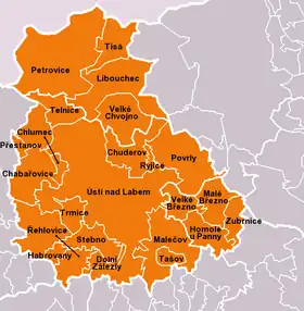 Chabařovice • Chlumec • Chuderov • Dolní Zálezly • Habrovany • Homole u Panny • Libouchec • Malé Březno • Malečov • Petrovice • Povrly • Přestanov • Řehlovice • Ryjice • Stebno • Tašov • Telnice • Tisá • Trmice • Ústí nad Labem (Aussig-sur-Elbe) • Velké Březno • Velké Chvojno • Zubrnice