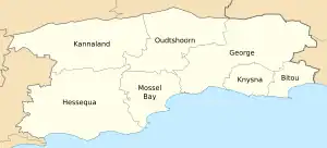 Les principales villes et localités du district sont George, Oudtshoorn, Mossel Bay, Knysna, Plettenberg Bay et Ladismith.