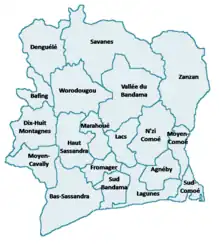Avant , le premier niveau de subdivisions administratives de la Côte d'Ivoire était les régions. En 2011, les régions ont été réorganisées en 14 districts (12 districts réguliers et 2 districts autonomes)[5],[6] par la loi n°2011-262 du 28 septembre 2011. Voici un résumé de la façon dont les districts ont été construits à partir des anciennes régions :