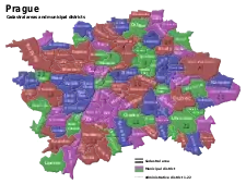 La ville de Prague dispose d'une structure administrative à trois niveaux : le Magistrat de la Ville-Capitale de Prague, 57 districts municipaux, et 22 districts administratifs.