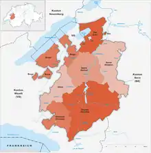 En décembre 2012, le canton de Fribourg compte 7 districts[1] dont quatre ont le français pour langue officielle et un l'allemand (district de la Singine). Le district du Lac et le district de la Gruyère sont bilingues (la commune de Jaun, Bellegarde en français, est la seule commune de langue alémanique du district de la Gruyère).