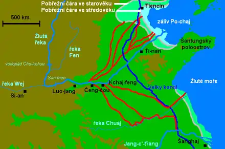 En 602 av. J.-C. les sources de la dynastie Han mentionnent un changement de cours. Le fleuve quitte son lit précédent au niveau de Huaxian et adopte un lit plus méridional en se rapprochant de la péninsule du Shandong. Il continue de se déverser dans le golfe de Bohai, dont le littoral progresse vers l'est au fur et à mesure de son comblement par les alluvions[5],[6]. Au début du Ve siècle av. J.-C., l'embouchure du fleuve Jaune se situe dans les environs de la ville de Cangzhou[5],[6], à Huanghua (黄驊), dans le Hebei, au sud de Tianjin[2].