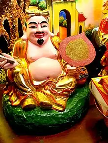 - À gauche : (à Singapour et en Malaisie) "Le Dieu de la Richesse Propriétaire Terrien des Tang d'Outre-Mer" (唐番地主財神) ou (à Hong Kong et dans la diaspora chinoise ailleurs) "Le Dieu de la Richesse Propriétaire Terrien de l'Avant à l'Arrière" (前後地主財神)