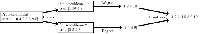 - Combiner : calculer une solution au problème initial à partir des solutions des sous-problèmes.