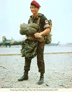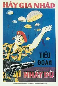 La division aéroportée vietnamienne (en vietnamien: Binh chủng Nhảy dù Việt Nam Cộng hòa [QLVNCH] - en anglais: Republic of Vietnam Airborne Division [RVNAD]) était l'une des premières composantes des forces militaires de la république du Vietnam ( vietnamien : Quân lực Việt Nam Cộng hòa - QLVNCH). La division aéroportée vietnamienne a commencé en tant que compagnies organisées en 1948, avant tout accord sur les forces armées au Vietnam. Après la partition du Vietnam, il est devenu une partie de l'armée de la république du Vietnam. Cette division avait ses origines distinctes dans les bataillons de parachutistes formés en France, les bataillons prédécesseurs participant à des batailles majeures, dont Dien Bien Phu, et conservant des uniformes et des insignes distincts[1]. Avec la formation d'une république indépendante, les parachutistes coloniaux ont été dissous, mais les insignes et l'esthétique aux côtés du surnom de "Bawouans" seraient conservés.