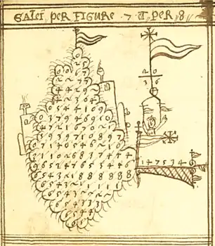 La figure de référence est extraite d'un manuscrit vénitien datant de la fin du XVIe siècle[4]. Elle présente la division de par : on lit le quotient et le reste . La preuve par 9 présentée sous le drapeau n'est pas équilibrée. Elle met en évidence une faute de calcul, le reste juste étant .