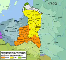 À la suite des pertes territoriales du Deuxième partage de la Pologne, la Diète de Grodno de 1793 a introduit une nouvelle division administrative (l'italique marque les nouvelles voïvodies)[5] :